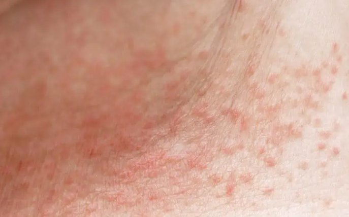 - Onset in humid conditions. When sweat ducts become clogged, trapped moisture causes red, itchy bumps especially under clothing or equipment straps.